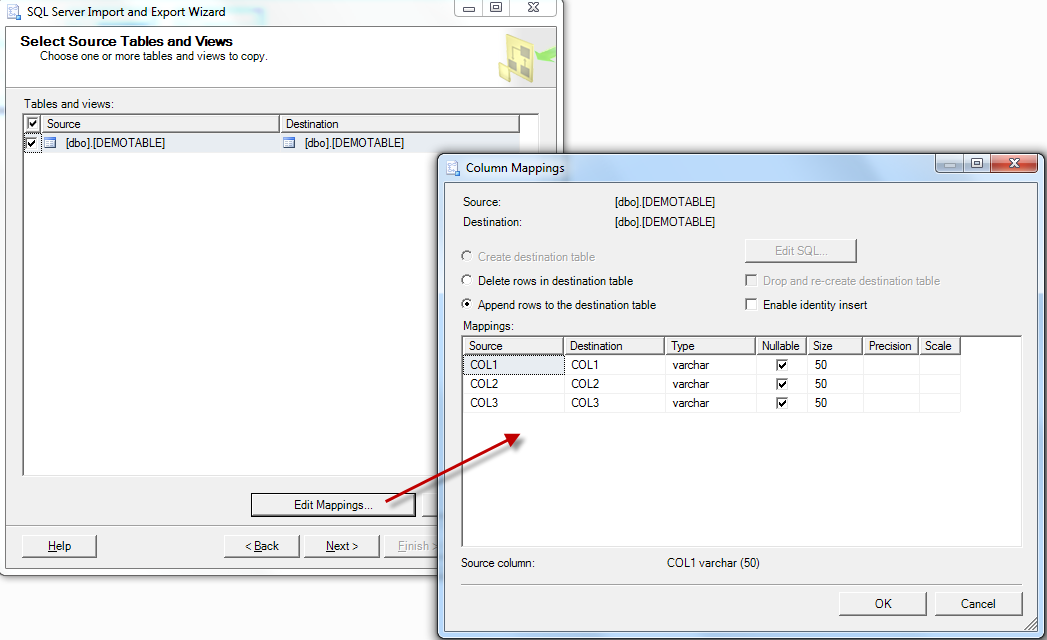 选择“copy data from one or more tables or views” 选择需要导数据的表,并且可以编辑列的Mapping关系。