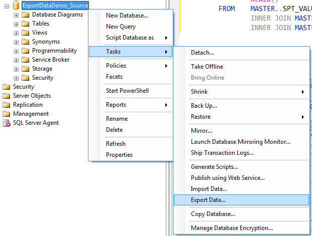 建立测试表并生成100万的测试数据01.使用SQL Server Import and Export Tool使用SQL Server Import and Export Tool进行数据的导出,也可以在目标数据库端使用Import进行导入,这部分套件也是SSIS的一部分。 在源数据库上右键,选择Task -> Export Data