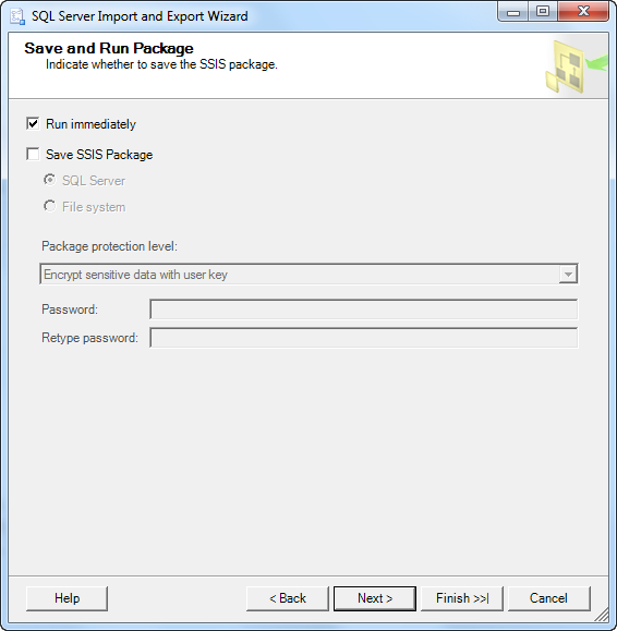 可以选择立即执行或者存储为SSIS的包,用于执行计划等其他用途。 这里我们选择立即执行。
