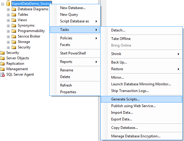 02.使用Generate Scripts生成脚本在源数据库上右键,选择Task -> Geneate Scripts...