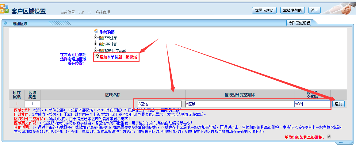 设置一级区域,点击“增加单位一级区域”,录入名称等信息,点击增加,如下图: