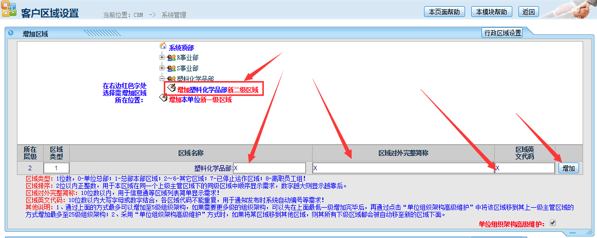 、设置子区域,找到对应的一级区域点开,点击增加“所在区域”新二级区域,录入名称等信息,点击增加,完成,如下图: