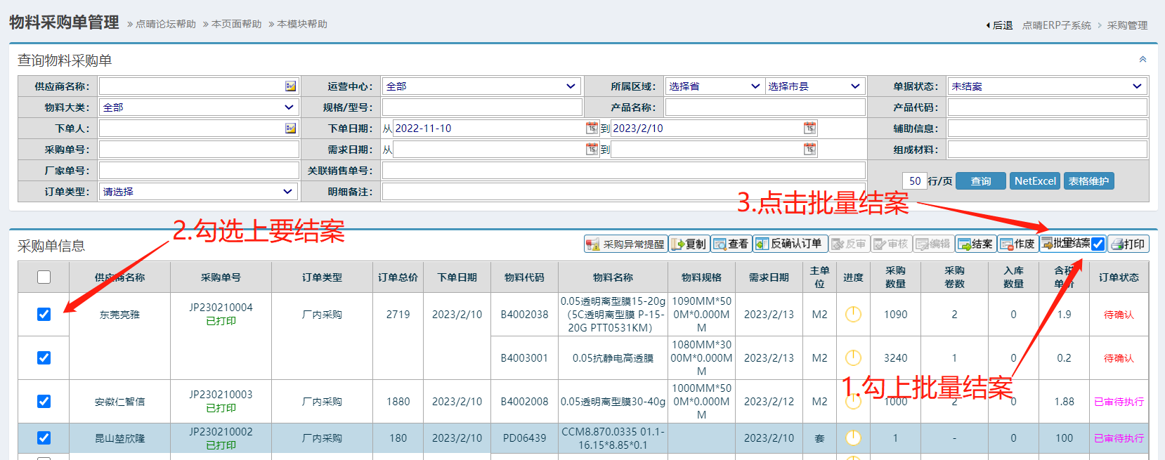 点晴模切ERP-采购单如何批量结案