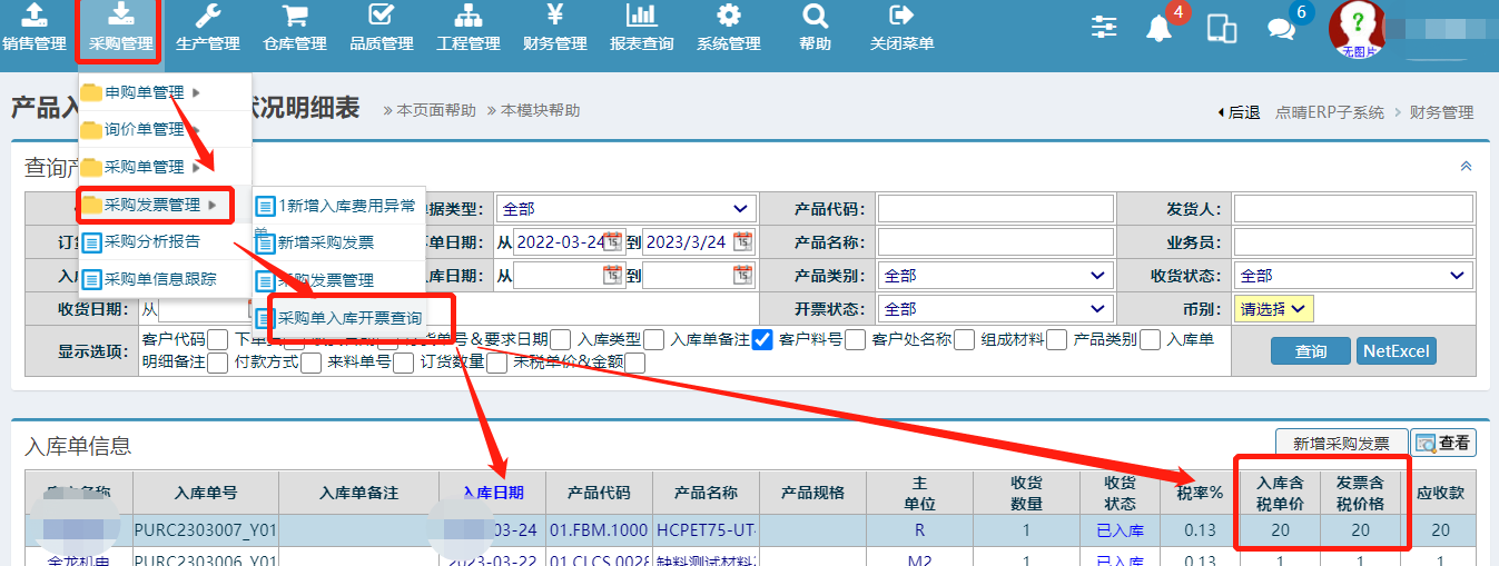 提交完后,在采购入库单开票查询可找到,然后可续继开采购发票的流程。 如下图: 点晴模切ERP更多信息:https://moqie.clicksun.cn,联系电话:4001861886 该文章在 2025/9/25 10:00:11 编辑过 |