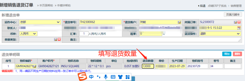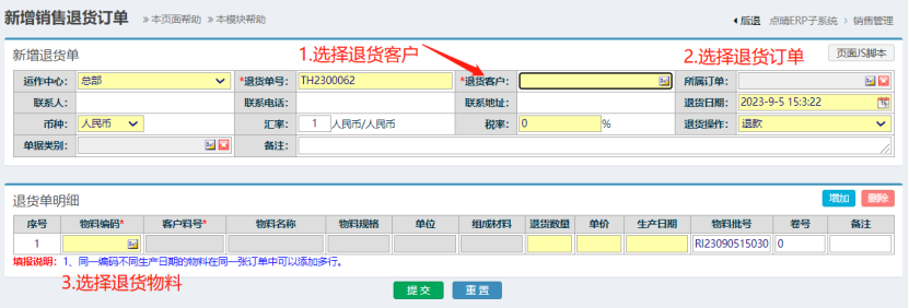 补充说明:退同一订单多个料时,点击添加,再选择物料即可。