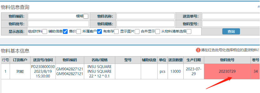 找到要退货的物料,点击对应的批号,即红色部分的。