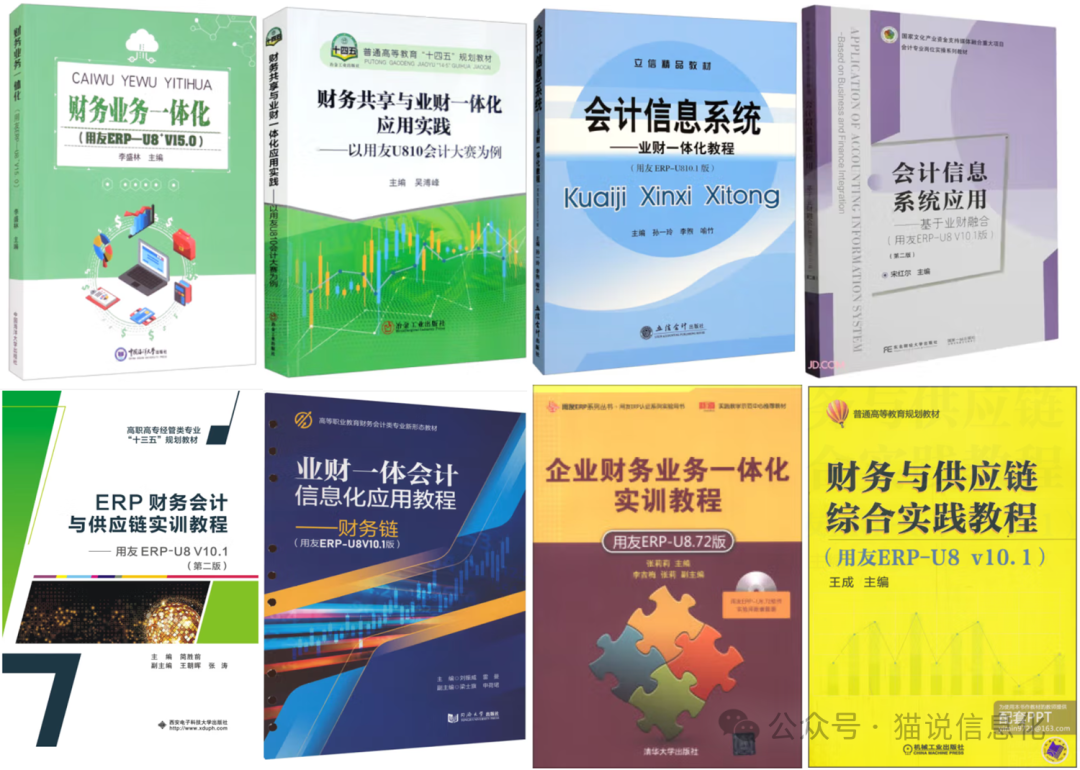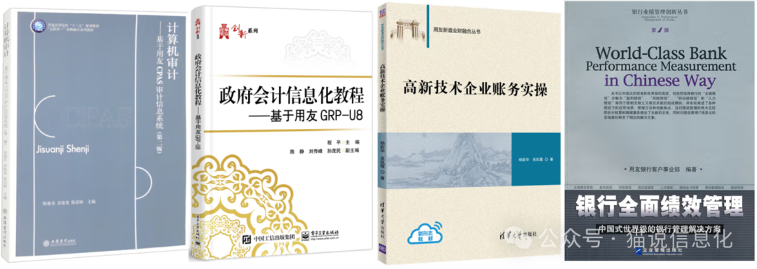 (注:我个人在几个电商平台上目前能搜索的结果如上,一些教材可能出版的较早,还有一些U8的教材我觉得太多太雷同,就没有再截图) 用友相关的书还有一本讲解审计的(补充:用友体系下有家专门提供审计软件的公司,北京审友数治科技有限公司,原名:北京用友审计软件有限公司,是用友集团在审计软件事业部的基础上2006年成立的),有一本基于U8的政府会计信息化教程,一本高新技术企业账务实操的书,还有一本用友当时的银行客户事业部编写的银行全面绩效管理。