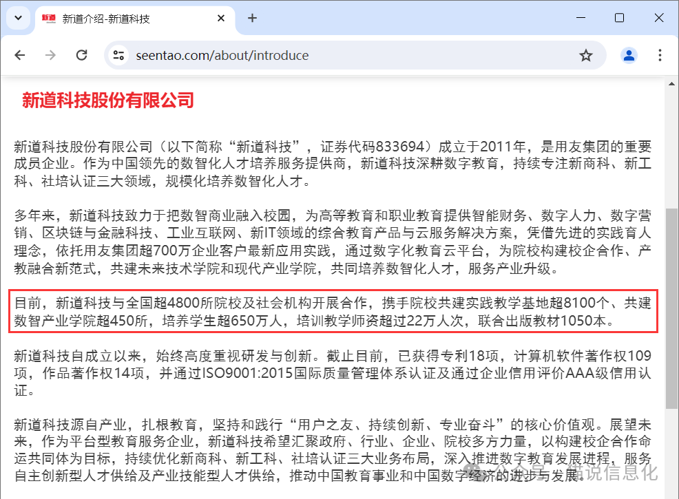 相当于,虽然用友的专业书数量也比较大,但绝大部分都是写U8的书,而且主要是财务方面的居多。用友U8是一款有着20多年历史的ERP产品,是面向中小型企业的ERP产品,这么多写U8的书也侧面说明了U8在其客户群中是比较成功的产品,但这么多书写U8也让人有点意外。 同时,这些书当中大部分都是学校和培训机构的教材,包括高等教育、职业教育的,面向的读者主要是财务专业的学生和财务工作人员以及用户。这些教材的作者很多都是高校的教师,尽管学界和产业界一直都在努力,但学校教育与实际工作必然存在很难避免的差异,这些教材对普及和教育财务信息化知识是非常重要的,但对用友生态的ERP顾问来说,这些书可以发挥的作用可能就非常有限了,即用友的这些书不容易帮助顾问形成更好交付能力。 另外,虽然用友U8是一款经典的ERP软件,但这么多教材写U8,直观感觉同质化好像比较突出。U8毕竟是面向中小企业的ERP软件,相对于面向大型企业和集团用户的大型ERP软件来说,U8的功能相对不是那么复杂,在一定程度上说,对以普及会计信息化或者财务信息化基础知识为主要目的的教材来说,也不能对软件和应用写很深的内容,如果都写一款基础ERP软件的基础内容,同质化似乎更加突出了。是否真的需要这么多这类教材呢? 补充一点,用友体系下有一家专注新商科、新工科、社培认证三大领域业务的公司,即:新道科技股份有限公司,上述教材中有一部分是新道作为用友软件原厂组织编写和提供支持的。来自新道官网的信息: