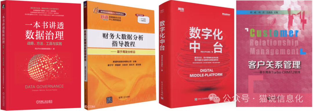 用友有两本关于数据比较新的书,还有一本配合用友当时中台战略的书,都是用友原厂编写的。我还搜到了一本写用友CRM产品的书。
