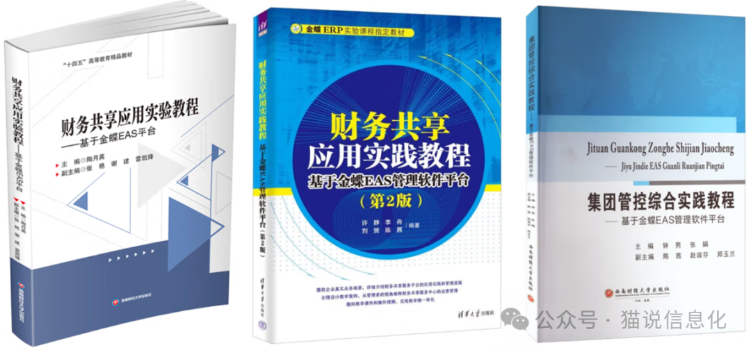 以上金蝶的财务、供应链等专业书都是写K3系列产品的,而关于金蝶面向大型企业和集团用户的大型ERP产品(EAS、EAS Cloud、苍穹\云星瀚)的书也是很少,其中有两本是EAS财务共享方面的,一本是集团管控方面的。