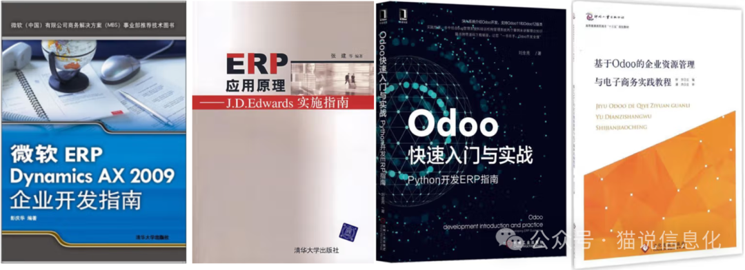 搜索的过程中,也顺便搜了一些其他ERP厂商的书,只有几本,微软Dynamics的一本,JD Edwards是Oracle旗下另外一款ERP产品,Odoo(原名OpenERP)是一款开源框架。这几个国外的ERP软件,在中国使用的相对比较少,所以中文正式出版物相应也比较少。而国外的ERP产品,在国外有更多的一些专业书,包括SAP,还有不少英文专业书,也没有翻译为中文在中国出版。
