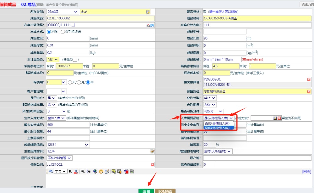 在入库需要品检栏位选择“是(以待检品入库)”,选择后点击“编辑”按钮完成