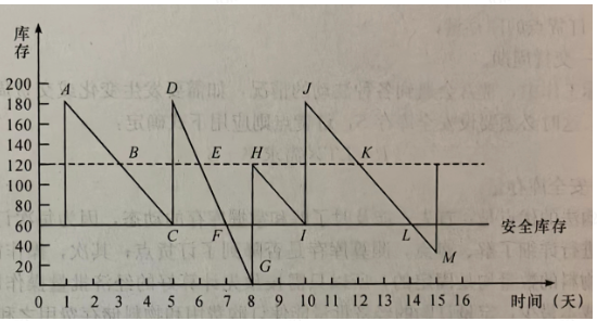 3. 定量订货法的优缺点: 优点:①能及时了解和掌握库存的动态,因为每次订货前都必须对库存情况进行详细了解、盘点,测算库存是否降到了订货点; ②操作简便、易行,因每次订购物料的数量均是固定的,所以只需按预先计算好的经济批量操作即可; ③能使仓库总成本最少,定量订购的经济批量能使订购费用和物料储存费用之和达到最佳。 缺点:①工作量大,需经常对库存物料进行详细的检查、盘点,增加了仓库作业成本; ②该订购方式要求对每个品种的物料单独进行作业,增加了订货成本和运输成本(但在现在的IT系统支持下,这个问题已经得到了很好解决)。 4. 应用案例: 假设经济批量为120个单位,安全存量S=60,需求率=30/天,交货周期LT=2天。在第1天,经济订购批量EOQ=120个单位全部到货,加上安全存量60个单位,总库存量为180个单位,如图所示: