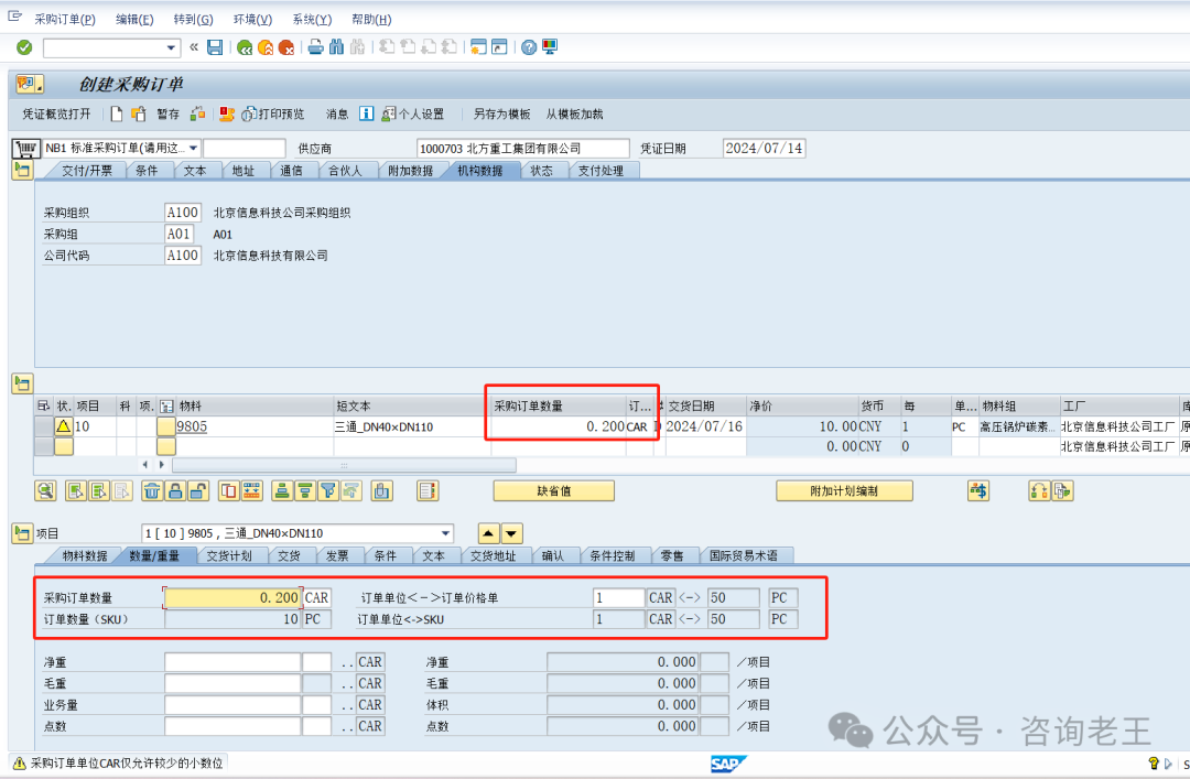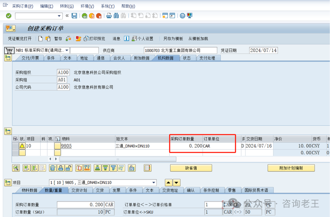 采购订单创建时,先输入物料按基本计量单位的数量10 PC,回车后,系统自动转换为按采购订单单位的数量0.2 CAR。