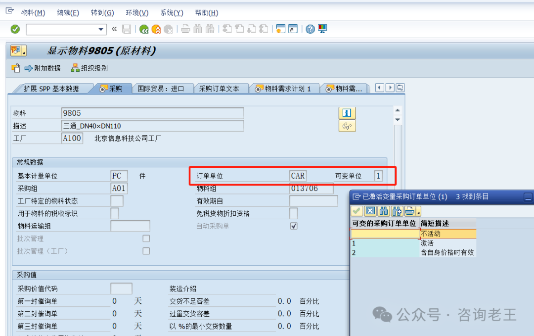对于上面的这几个业务场景的问题,怎么办呢?其实可以考虑激活物料的“可变单位”标识,当“可变单位”值等于1,则为激活。对于“可变单位”的作用,简单来讲,就是激活后,系统就允许在采购信息记录及采购订单等业务单据中使用不同于默认的订单单位的其他采购单位。
