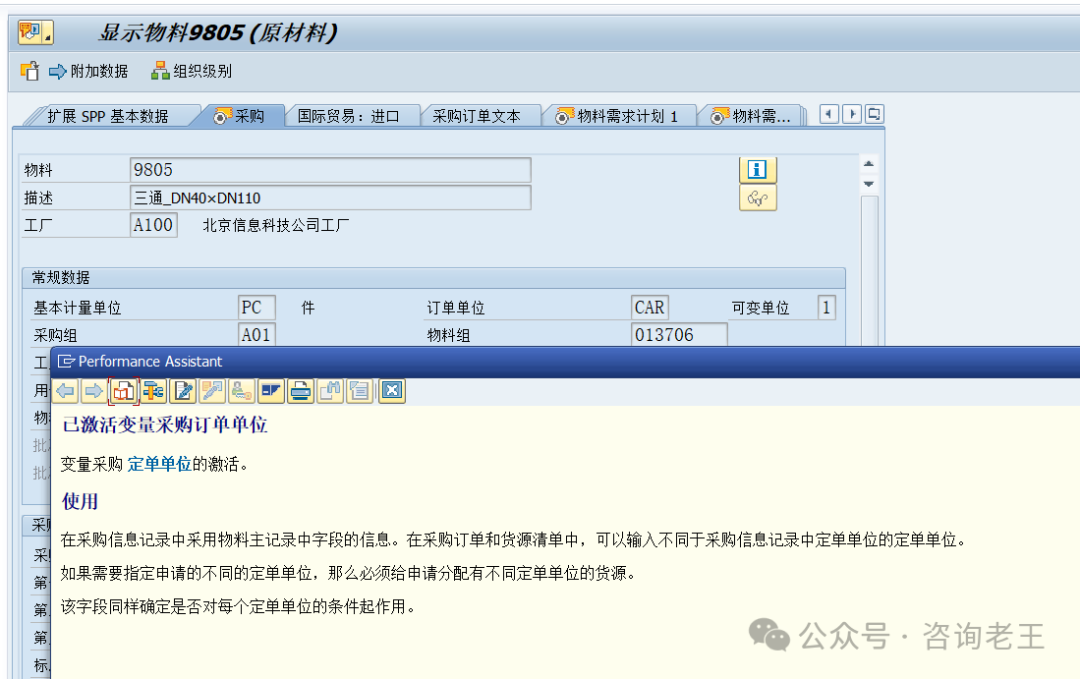 在物料采购业务中,对很多物料可能都会涉及采购单位的问题,即一个物料的库存基本计量单位可能是“副”,但在实际采购业务过程中,因为包装规格的不同,采购时可能需要按“捆”、“袋”、“箱”等单位进行采购,那在系统如何按这些不同的采购单位进行采购订单的创建呢?有的小伙伴会说,那就启用物料的采购订单单位,并维护好和基本计量单位的转换关系,这样在创建采购订单时就可以维护的订单单位进行订单创建了。第一,物料主数据上的“订单单位”是在MARA表中,没错,物料采购视图中的采购订单单位字段是属于集团级的,也就是说在整个集团中,这个字段只能维护一个值(对于这个字段的组织层级关系,大家可以看我之前这篇文章《SAP-谈谈物料主数据中几个容易理解错组织层级的字段》)试想,如果在一个比较大的集团下,物料如果同时存在多个有效的采购单位,那该如何维护物料这个订单单位字段呢?第二,启用了物料订单单位后,在以后创建采购订单时都必须使用此订单单位,如果你想使用基本计量单位或其他的采购单位,即使你选择了其他单位,系统也会按照维护的转换关系,将订单中录入数量转换为订单单位的数量,是不是让人感觉这样不够灵活呀。