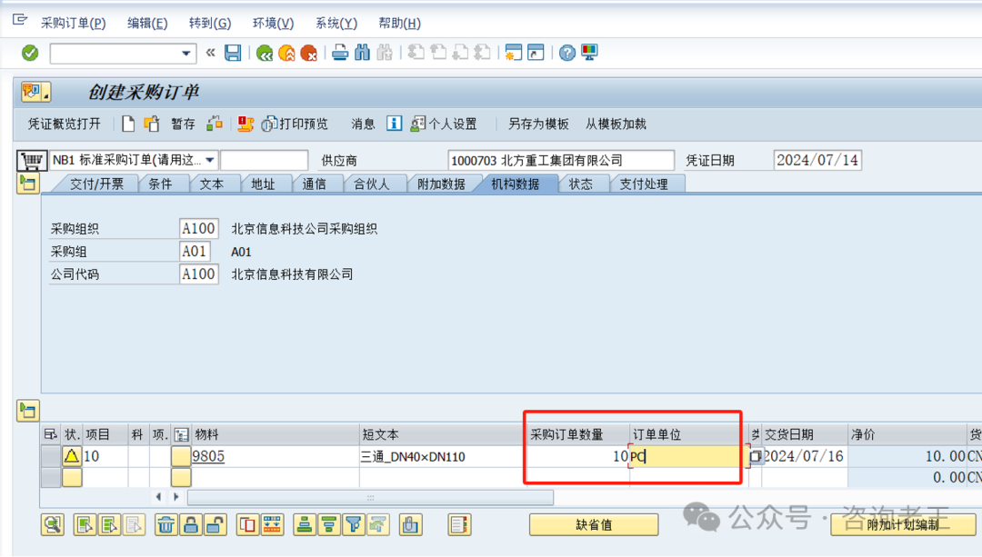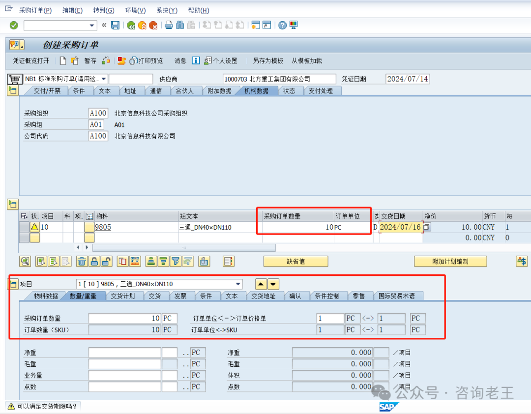 采购订单创建时,输入物料按基本计量单位的数量10 PC,回车后没有变化,可以直接按10 PC创建并保存采购订单。