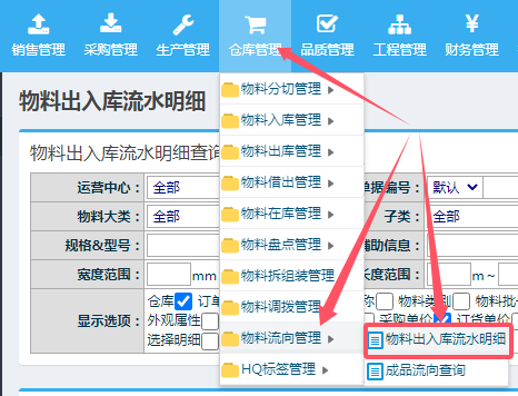 进入仓库管理-》物料流向管理-》物料出入库流水明细中(如果看不到此菜单,则应该向管理员申请开放此菜单访问权限):