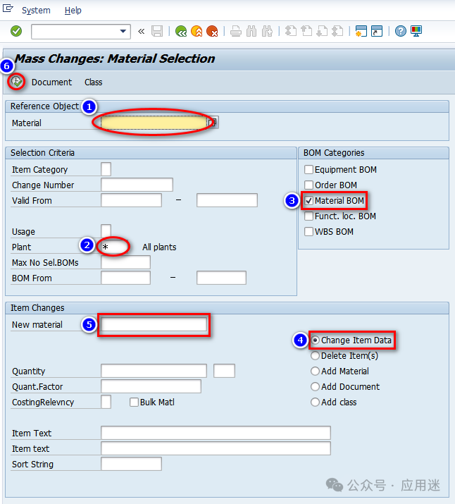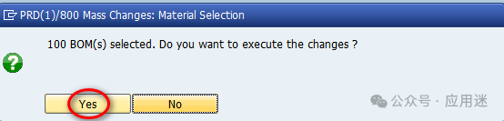 一个工厂或者多个工厂的所有包含A组件物料的BOM需要将组件物料A批量替换成B,请问如何处理?使用cs20事务码即可。在SAP起始页按下ctrl + /快捷键定位到事务码运行框,输入cs20,按下回车键。输入旧的组件物料编码(见①),输入工厂编码(见②),输入星号代指所有工厂,选择BOM类型(见③),选择具体操作(见④,一定是选择Change Item Data),输入替换后的新组件物料编码(见⑤),点击运行(见⑥,快捷键F8)。全选查找出来的BOM(见?,快捷键Ctrl+F5),点击Change Item Data(见?,快捷键是F8)。下图显示的BOM奇数行和偶数行颜色不一样,让行与行之间容易区分,设计比较贴心。提示已经选中了多少BOM,是否修改,点击Yes。窗口底部状态栏提示