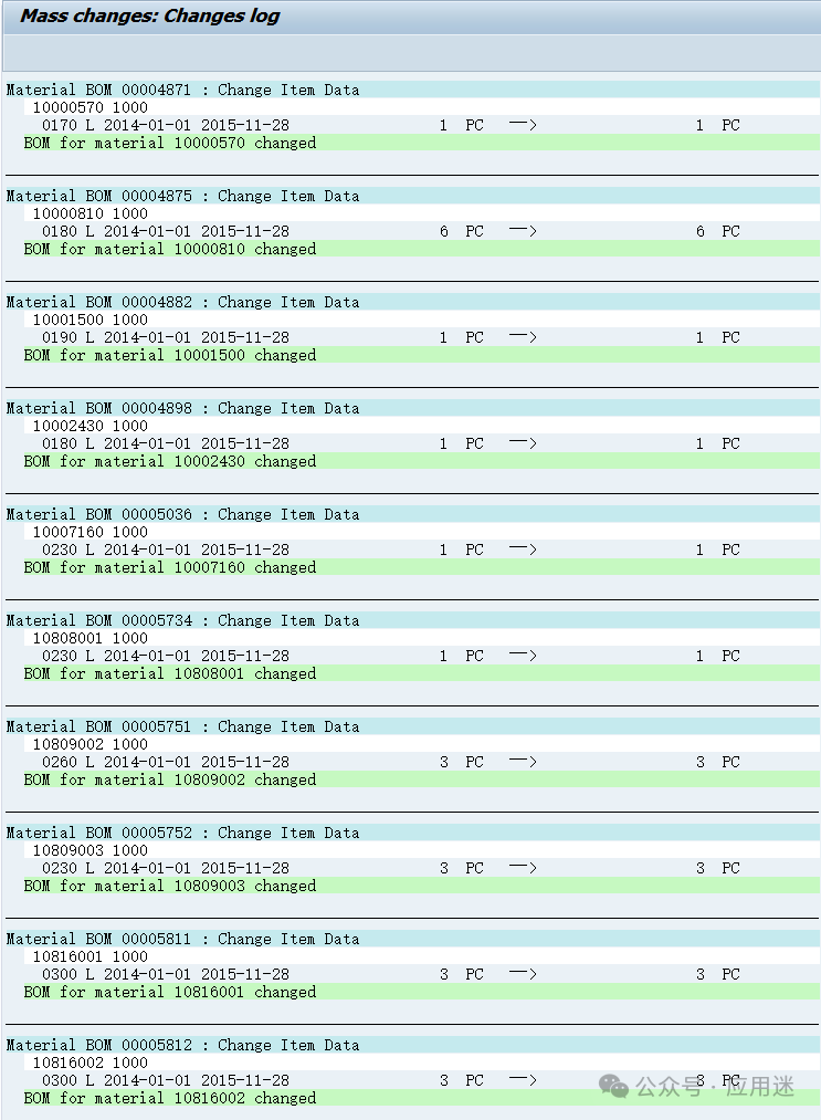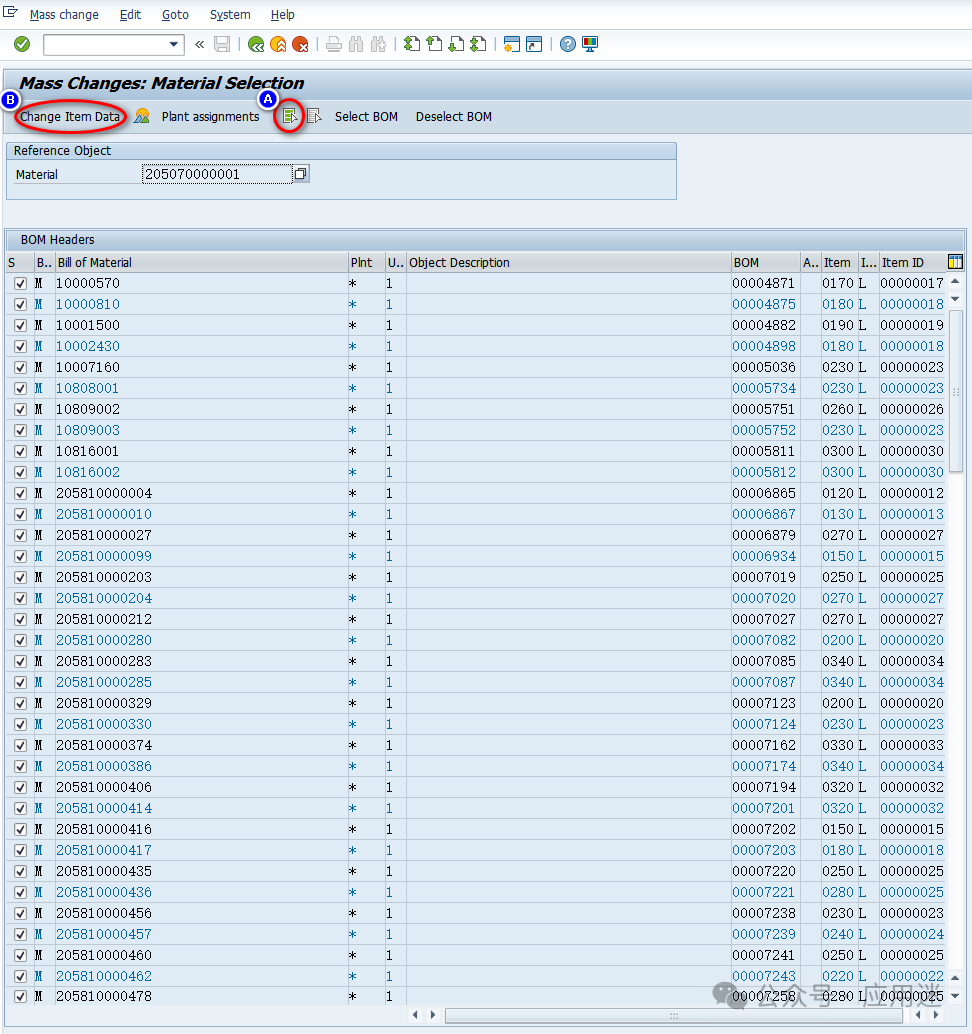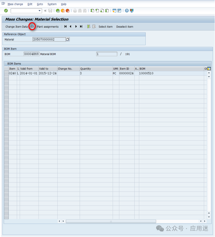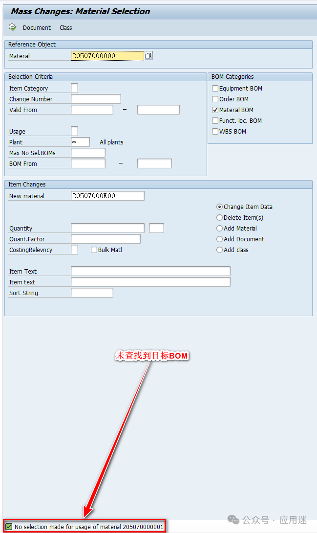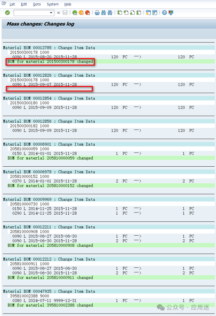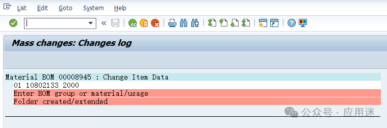 如果显示下图界面,就需要点击上面的帽子图标,然后全选BOM,点击Change Item Data。为什么会显示下图界面,而不是显示所有查找到的BOM?欢迎屏幕前的你留言讨论。批量替换完毕后会显示如下日志,有些会显示BOM for material XXXXXXXXXXXX changed,有些显示为空,大家知道是为什么吗?可以在文章下方留言讨论,期待大家的回音。 批量更改失败的会碰到下面这种情况,说明BOM group或者material/usage不存在,无法替换。