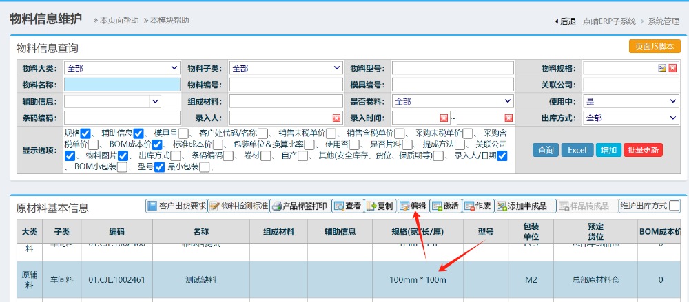 操作步骤: 系统管理-物料管理-物料信息维护