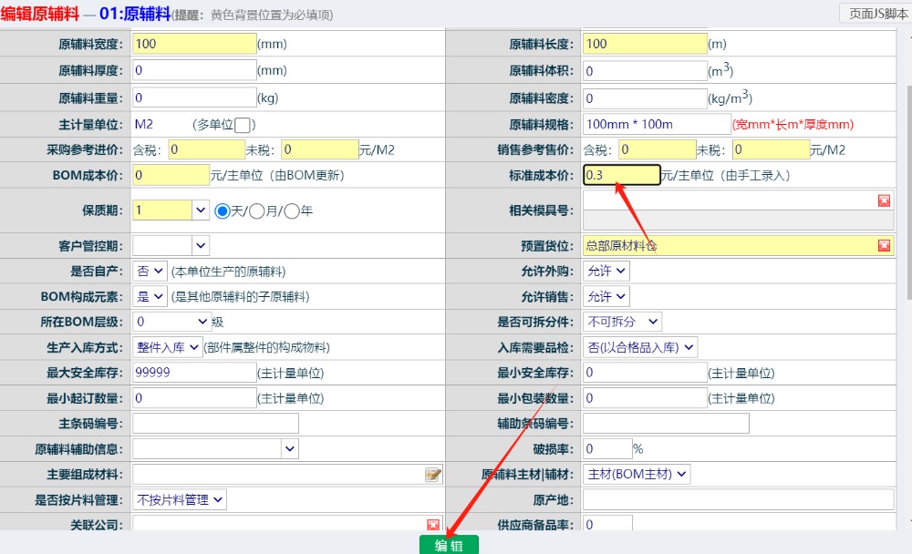 找到标准成本价栏位,填入对应的数值后,点击“编辑”按钮完成,注意,此单价填未税价 ![]() 点晴模切ERP更多信息:https://moqie.clicksun.cn,联系电话:4001861886 该文章在 2024/9/6 15:52:54 编辑过 |