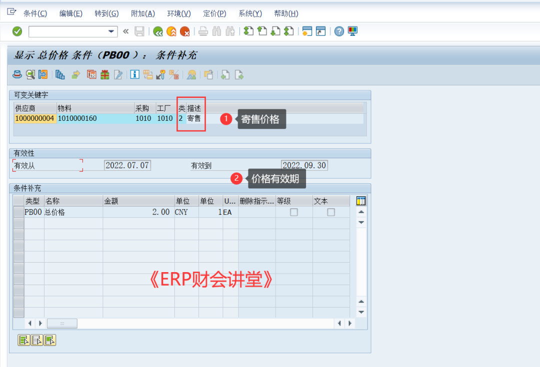记账金额等于数量乘以单价,数量是已知的,价格从哪里取的呢? 对于寄售业务,创建采购订单时是没有价格的,结算价格通过信息记录进行管理。在寄售转只有之前,需要维护供应商寄售结算价格。ME13查看寄售价格如下:
