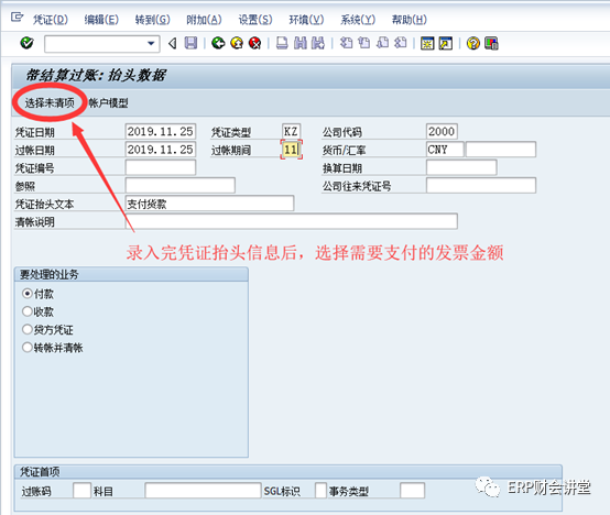 录入完凭证抬头信息后,点击“选择未清项”,选择需要清账的凭证行。
