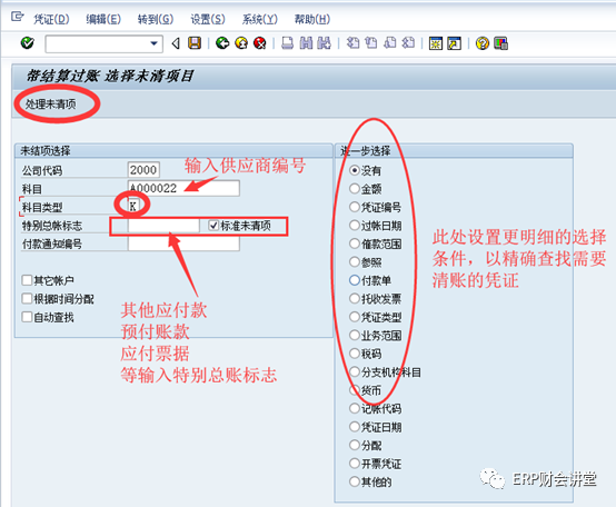 特别总账标志:对其他应付款、预付账款、应付票据等清账时,录入相应的特别总账标志,对应付账款清账时,勾选“标准未清项”即可。进一步选择:根据以上条件查询出来的是供应商应付账款的全部未清项,可能数据量比较多,可以在“进一步选择”中设置条件,缩小筛选的范围。设置完筛选条件后,点击“处理未清项”,进入清账界面。
