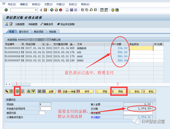 系统默认选中所有的金额(金额为蓝色表示已选中),根据实际情况选择需要支付的金额即可。一般情况下,点击图标1选中所有的凭证行,然后点击图标2取消选中所有的凭证行,然后再单独选择需要支付的金额。