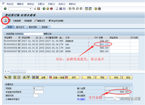 接下来,双击需要支付的金额(双击后变成蓝色,在屏幕右下方的“已分配”处显示选中的金额总计),然后选择红圈中的图标,录入银行科目。