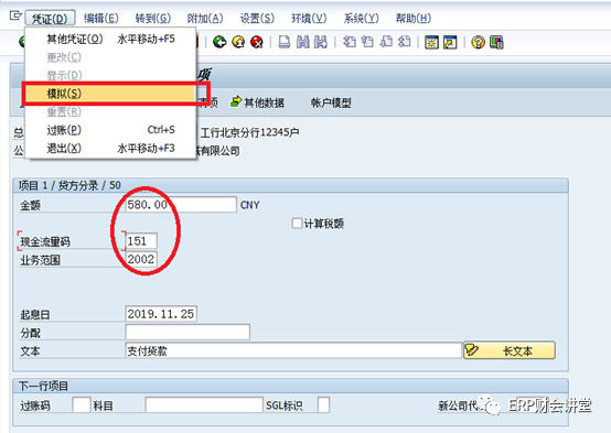 录入支付金额、现金流等信息后,选择菜单“凭证->模拟”预览凭证。