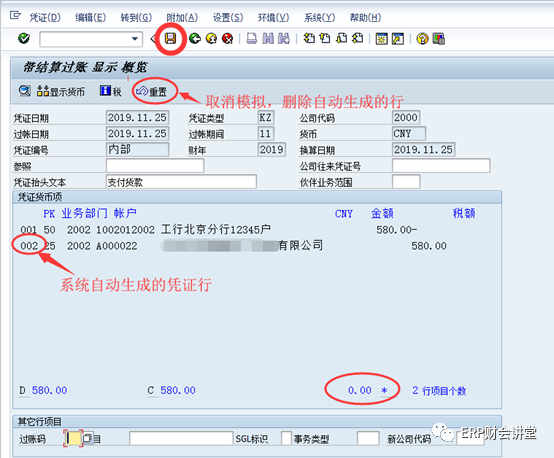 模拟后,系统自动生成了凭证的借方,核对无误后,点击保存即可。付款完成后,再次FBL1N查看供应商未清项时,可以发现凭证5100000012已经不见了。