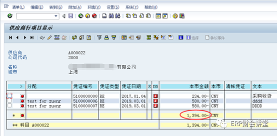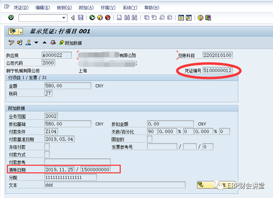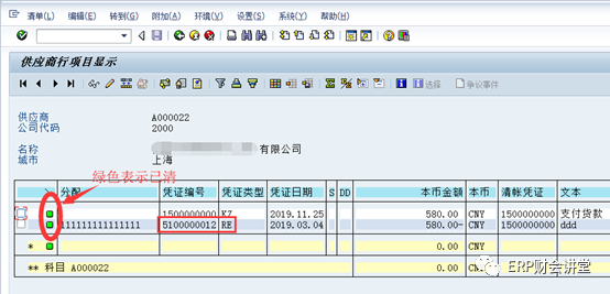可以发现,凭证5100000012是在2019.11.25被凭证1500000000清账的。以上就是SAP的未清项管理功能,以及对应的清账操作。通过清账将原始凭证和清账凭证关联起来,实现了业务的一一对应。