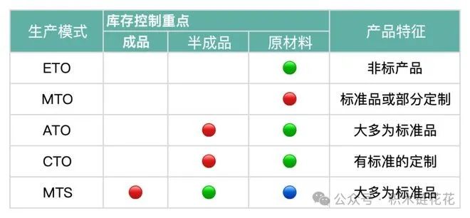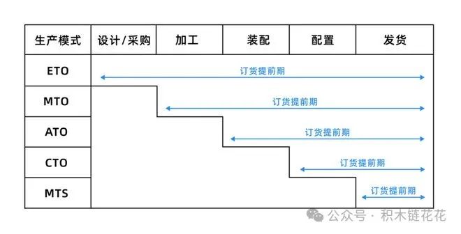从订单角度看: MTS模式下的交货期是最短的,不过其库存量最大,面临着成品库存方面的压力。 ATO/CTO模式下,交货期仅仅是装配所需要的时间,成品库存相对较少,但存在半成品和原材料库存方面的压力。 MTO模式的交货期比较长,存在着少量原材料库存方面的压力。 ETO模式的交货期最长,库存量较少,不存在库存压力。