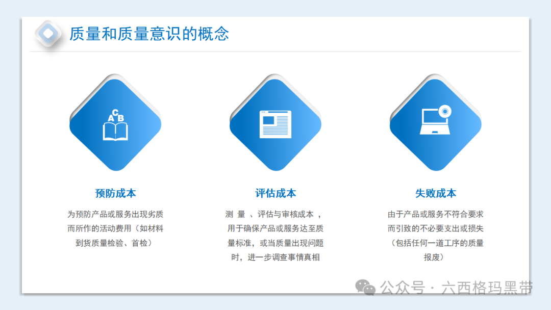 1. 品质不是检查出来的:质量不是通过最后的检查来保证的,而是在设计、生产和预防过程中形成的。每一个环节都要有质量意识,确保每一步都符合要求。