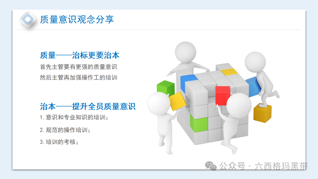 质量意识的提升是一个持续的过程,我们需要不断改善,持续改进。不是不愿改进,而是不屑于小的改进。原来的老思想根深蒂固,一时难以适应,但我们必须努力克服,以适应新的质量要求。质量的提升需要治标更要治本,首先主管要有更强的质量意识,然后主管再加强操作工的培训。治本的关键在于提升全员质量意识,包括意识和专业知识的培训、规范的操作培训以及培训的考核。