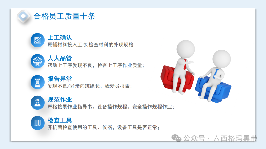 7. 人人品管:帮助上工序发现不良,检查上工序作业质量。