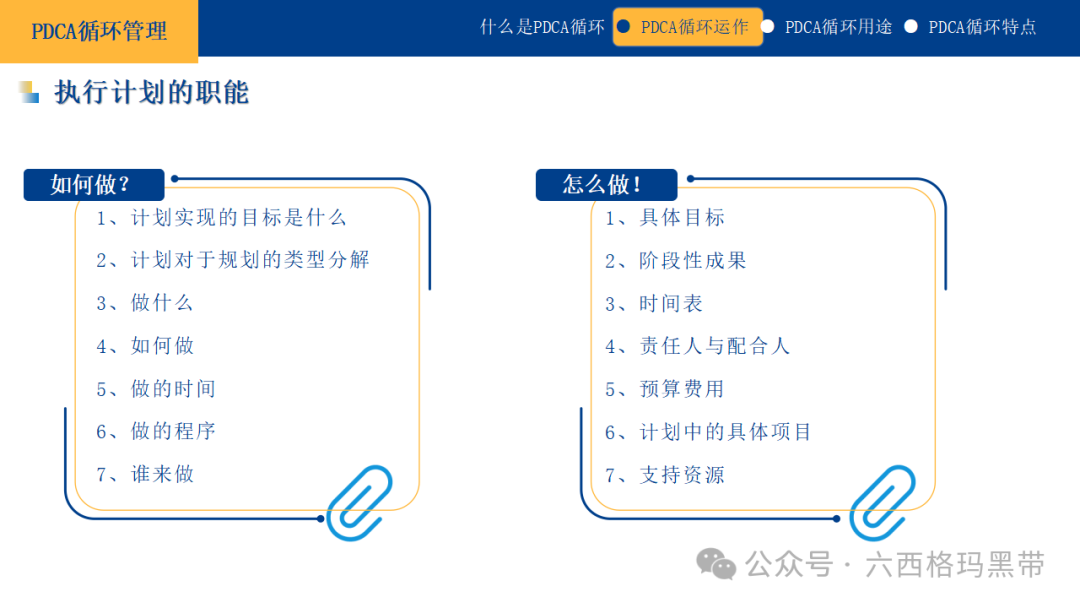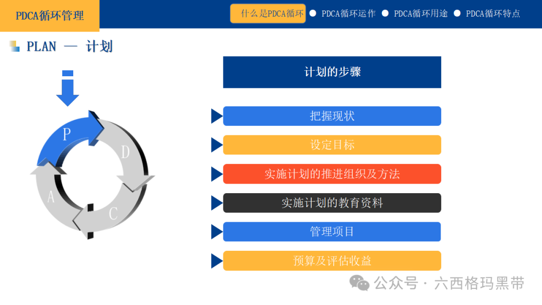 PDCA循环的实践价值持续改进的文化PDCA循环不仅仅是一种管理工具,它更是一种促进组织内部形成持续改进文化的驱动力。通过不断地计划、执行、检查和修正,组织能够培养出一种对现状永不满足、对未来持续探索的态度,鼓励员工主动发现问题、提出改进意见,从而形成一种积极向上的工作氛围。 增强应变能力在快速变化的市场环境中,PDCA循环帮助组织增强了对外部变化的敏感度和响应速度。通过定期的评估和修正,组织能够迅速调整策略,适应新的市场需求或应对突发状况,确保在竞争激烈的环境中保持领先地位。 促进团队协作PDCA循环的实施需要跨部门、跨职能的紧密合作。在计划阶段,团队成员共同参与目标设定和方案制定;在执行阶段,各自承担责任,协同工作;在检查和修正阶段,共同分析成果,分享经验教训。这一过程不仅加强了团队成员之间的沟通与协作,还促进了知识共享和团队凝聚力的提升。 提升决策质量PDCA循环强调基于数据和事实的决策。通过系统的数据收集、分析和反馈,管理者能够更加准确地了解实际情况,做出更加科学、合理的决策。同时,循环过程中的持续学习和经验积累,也为未来的决策提供了宝贵的参考依据。 实现战略目标将PDCA循环应用于战略层面,可以帮助组织将长期愿景分解为短期可实现的目标,并通过持续的循环迭代,逐步逼近并最终实现战略目标。这一过程不仅确保了战略的有效落地,还促进了组织能力的持续提升,为长期发展奠定坚实基础。 做计划的注意事项在PDCA循环中,计划阶段是整个循环的基石,一个周密的计划能够为后续的执行、检查和修正提供清晰的方向和坚实的基础。因此,在制定计划时,需要特别注意以下几个方面: 认清目的首先,必须明确计划的目的,这是计划制定的出发点和归宿。计划项目应紧密围绕组织或个人的长期目标展开,确保每一项计划都是对实现这些目标的有效支撑。同时,计划目标应具体、可量化,以便于后续的跟踪和评估。 充分掌握相关事项在制定计划之前,需要对现状进行全面、深入的分析。这包括了解组织内部的资源状况、能力水平,以及外部环境的机遇与挑战。只有充分掌握相关事项,才能制定出既符合实际又具有前瞻性的计划。 以5W2H法思考5W2H法是一种有效的思考工具,它帮助我们从多个维度审视计划,确保其完整性和可行性。具体来说,就是回答以下问题: