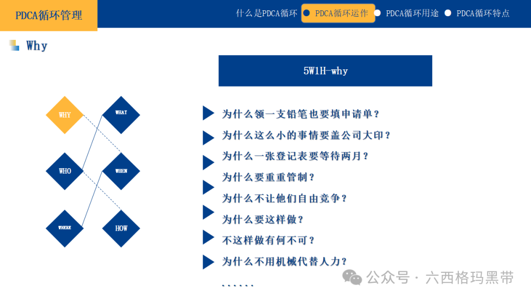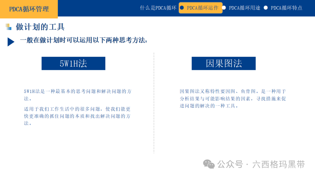 对于改善性计划,可以结合鱼骨图法(因果图法)来进一步分析问题的根源,并制定相应的改善措施。 实施方案及时间计划中的实施方案应具有可操作性和连贯性。可以将大计划分解为若干个小计划或阶段性目标,但每个小计划之间应有逻辑上的联系,共同支撑大计划的实现。同时,应明确每个阶段的时间安排,确保计划能够按时完成。 应有数据可衡量及成果评估计划应包含可量化的指标和成果评估方法。这不仅能够帮助我们在执行过程中跟踪进度,还能在计划结束后对成果进行客观评价。数据化的管理是现代企业管理的重要趋势,它能够使管理更加精准、高效。 思考方法5W1H法5W1H法是一种基本的思考问题和解决问题的方法,它涵盖了问题解决的六个关键方面: