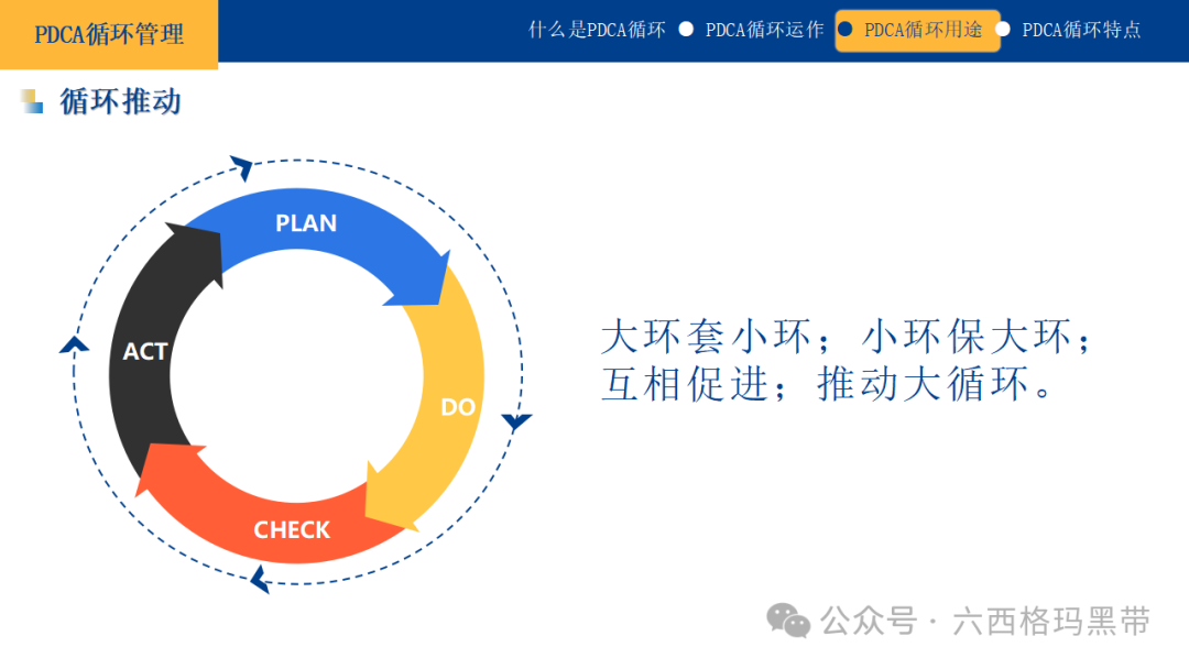 通过5W1H法的系统思考,我们能够更加全面地理解问题,制定出更加有效的解决方案。 因果图法(鱼骨图)因果图法,又称鱼骨图法,是一种用于分析结果与影响因素之间关系的工具。它通过将问题的主要原因(即“鱼头”)和次要原因(即“鱼骨”)以图形化的方式呈现出来,帮助我们直观地识别问题的根源,并找到解决问题的措施。鱼骨图法常用于质量管理、故障分析、项目管理等领域,是PDCA循环中检查阶段的重要工具之一。 PDCA循环的特点PDCA循环作为一种科学的管理方法,具有以下几个显著的特点: 大环套小环PDCA循环是一个层级结构,大循环中可以包含多个小循环。每个小循环都是一个完整的PDCA过程,它们相互独立,但又服务于大循环的目标。这种层级结构使得PDCA循环能够灵活地应用于不同层级的管理活动中,从组织战略到具体任务,都可以找到合适的循环层级。 小环保大环在PDCA循环中,小循环的成功是实现大循环目标的基础。每个小循环都应对其所在的大循环负责,确保其活动与大循环的目标保持一致。通过不断地优化小循环,可以推动大循环的持续改进和提升。 互相促进PDCA循环的各个阶段不是孤立的,而是相互关联、相互促进的。计划阶段为执行阶段提供了方向和依据;执行阶段将计划转化为实际行动;检查阶段对执行结果进行评估和反馈;修正阶段则根据反馈对计划进行调整和优化。这四个阶段形成一个闭环系统,共同推动组织的持续改进和发展。 推动大循环PDCA循环的最终目的是通过不断的迭代和改进,推动整个组织或项目的大循环向前发展。每一个小循环的完成,都是对大循环目标的一次逼近。随着PDCA循环的不断进行,组织能够逐步积累经验,优化流程,提升能力,最终实现战略目标和持续发展。