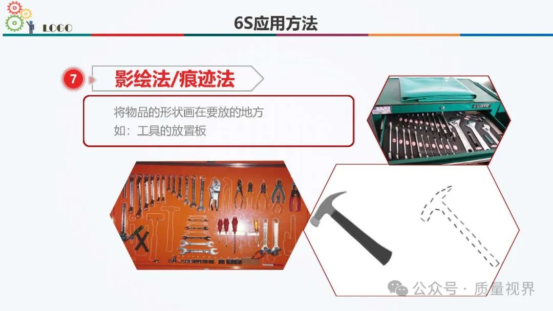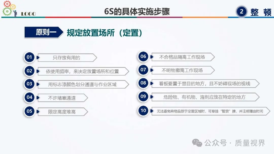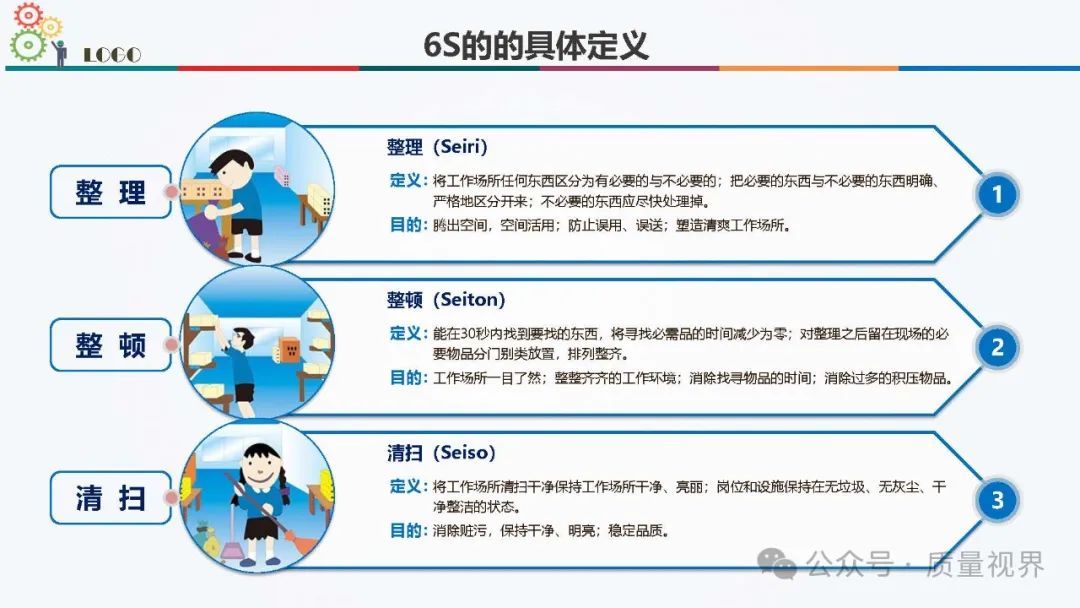 定义:把必要的物品按规定位置摆放,并摆放整齐,加以标识。定置定位:根据工作流程和操作习惯,为每个物品确定固定的存放位置,如在工具柜上绘制工具轮廓,使工具摆放一目了然。可视化标识:使用标签、颜色、线条等对物品和区域进行标识,如不同颜色的线条区分通道和工作区域。合理布局:按照操作顺序和使用频率,合理安排物品的摆放位置,减少寻找物品的时间。清扫(Seiso)