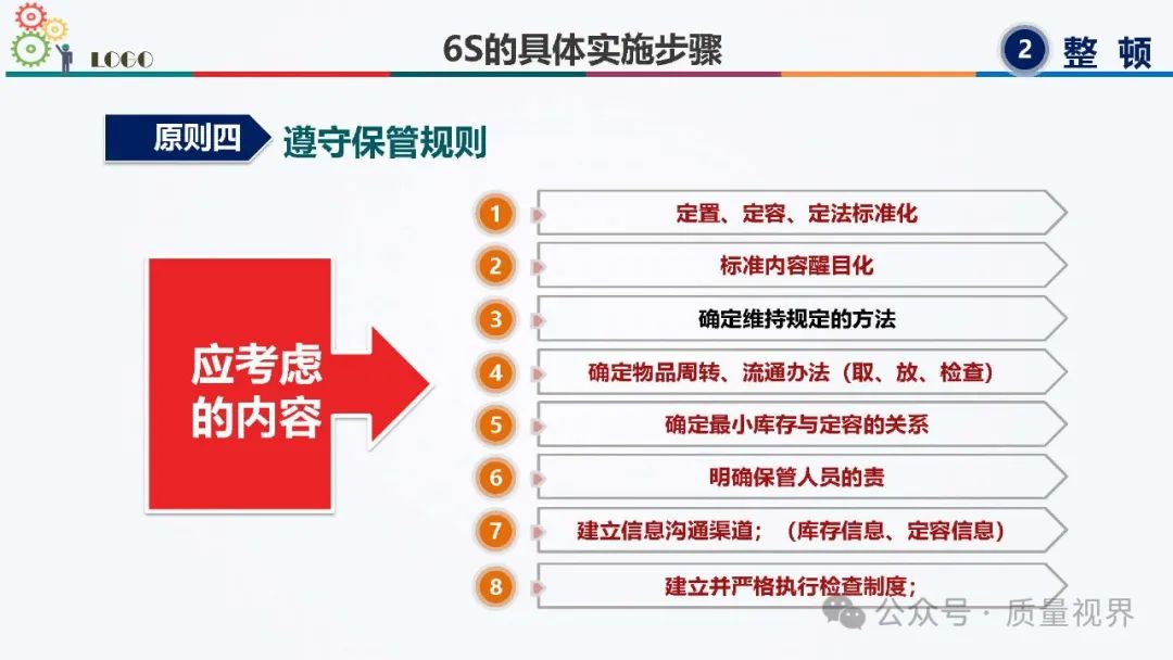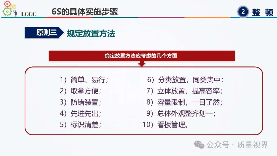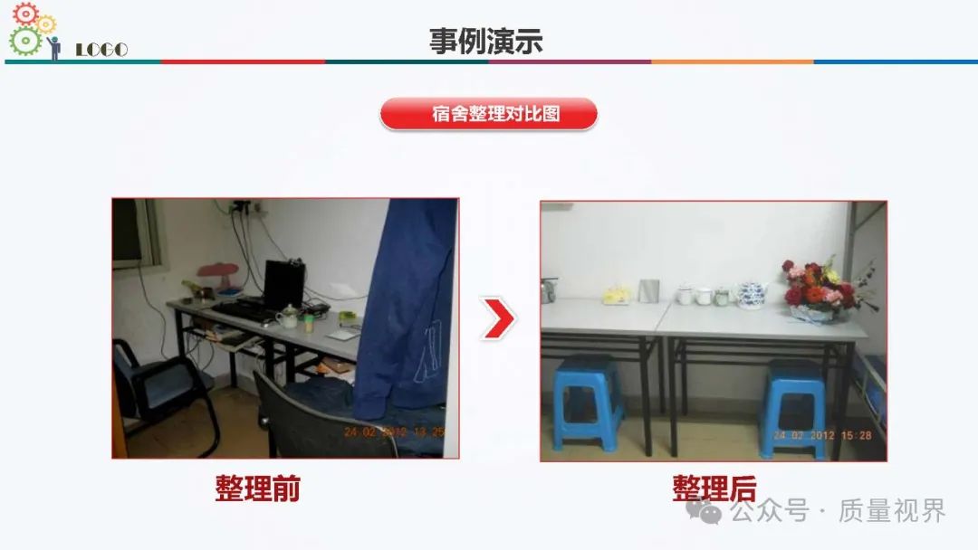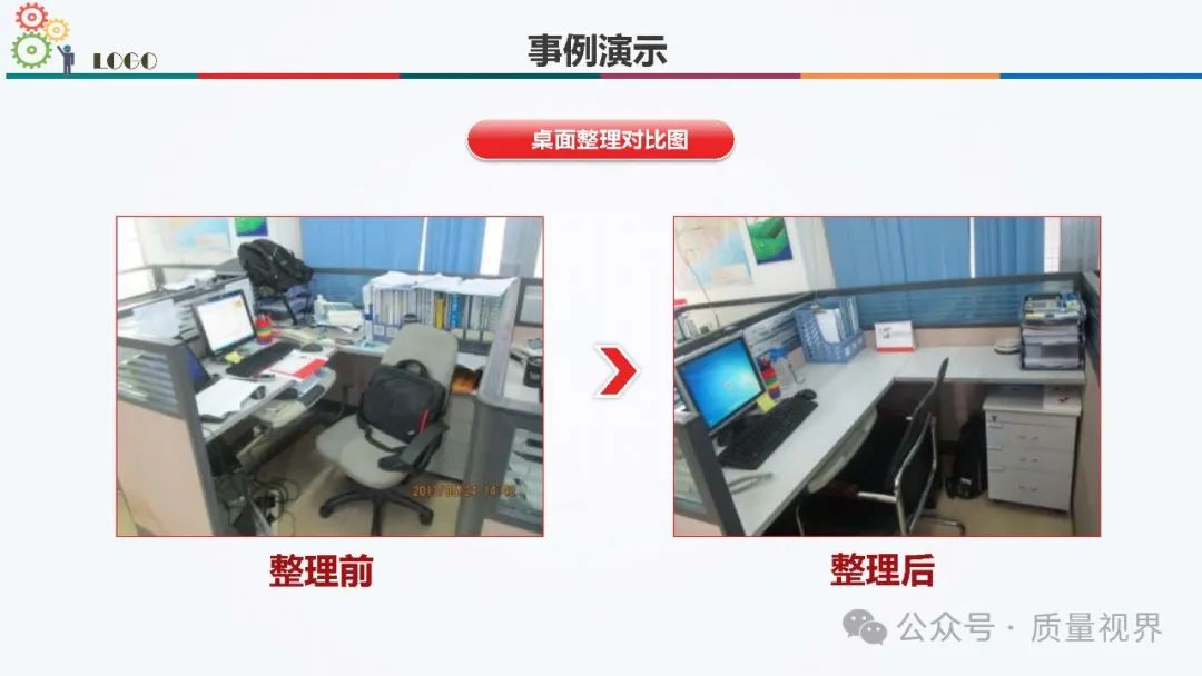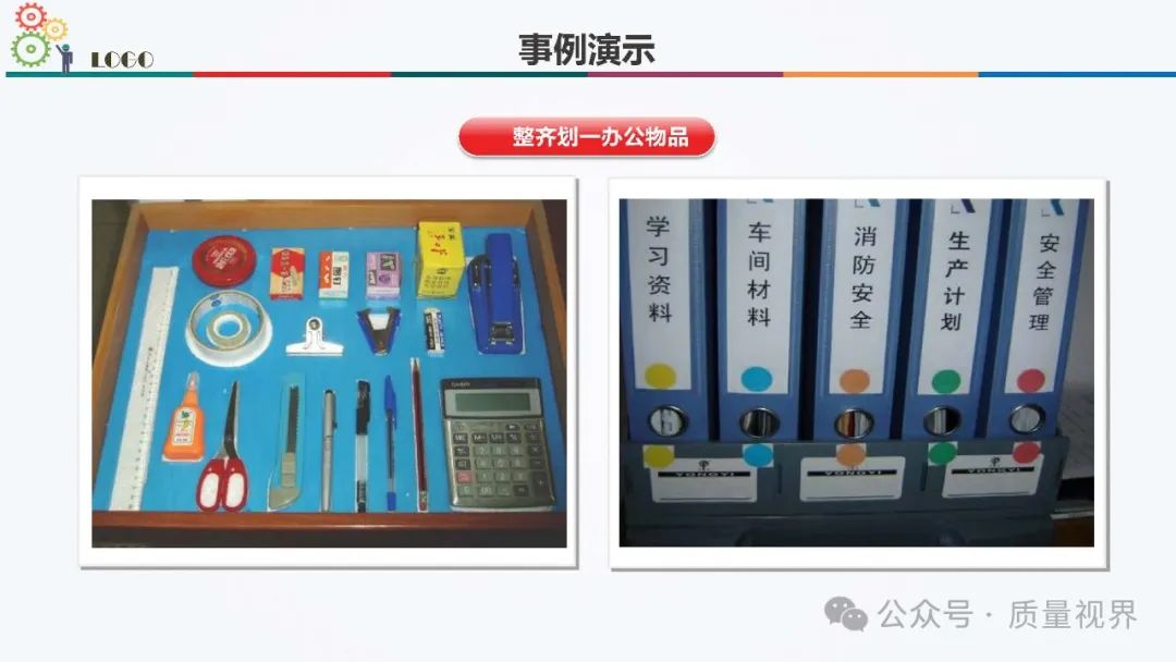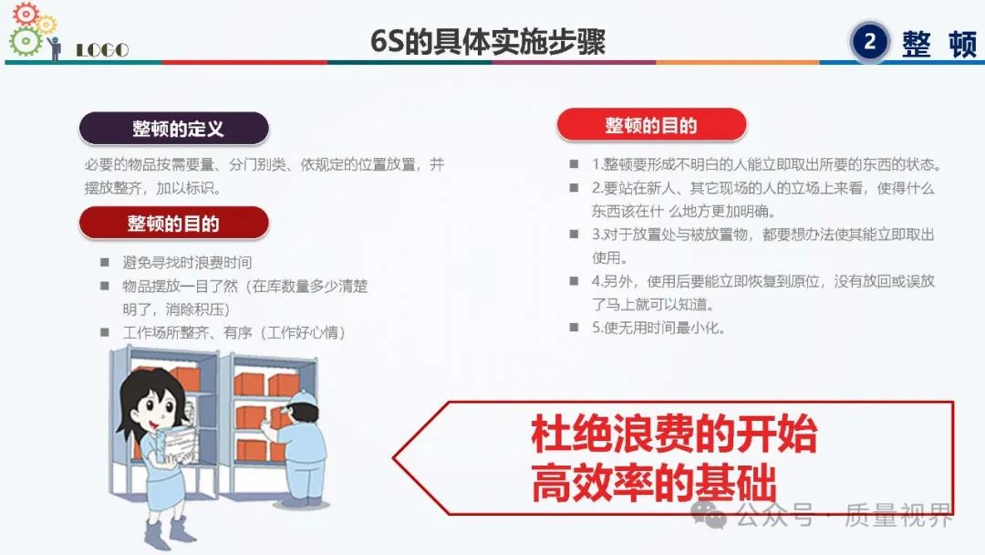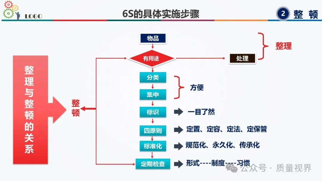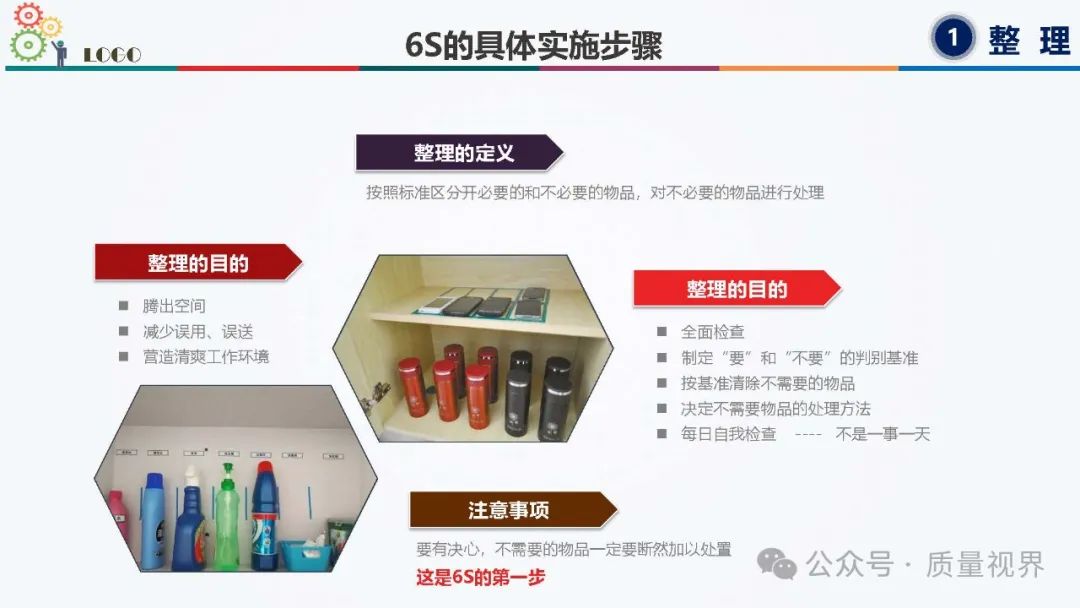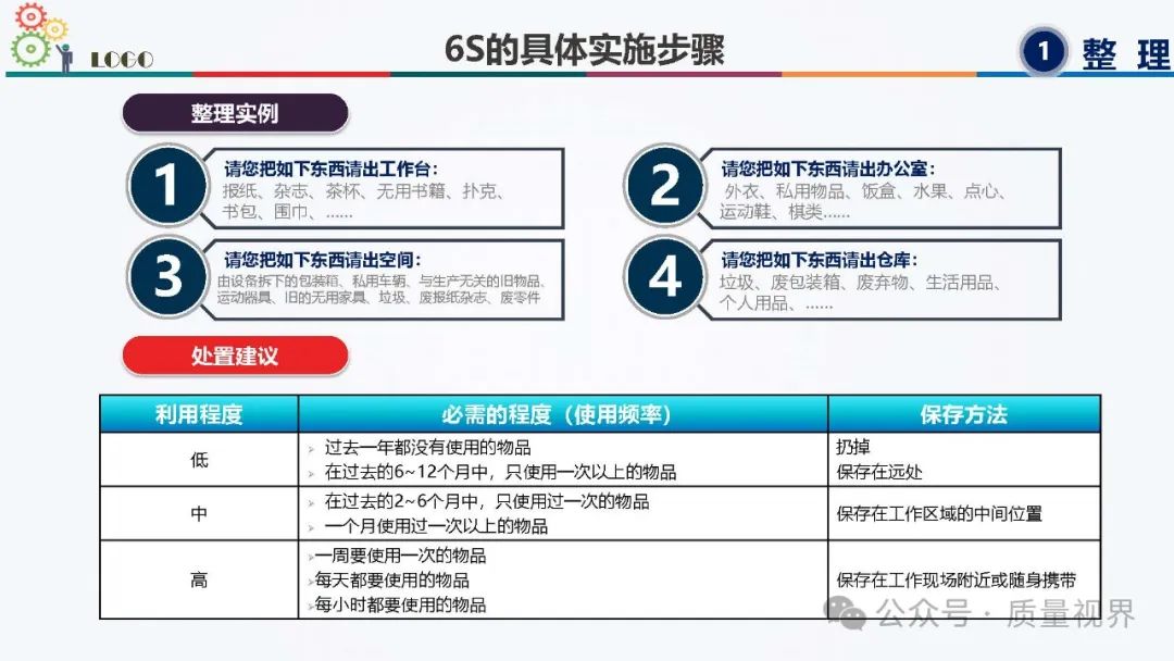 定义:将工作场所的物品区分为必要和不必要的,清除不必要的物品。全面检查:对工作场所的所有区域,包括设备、工具、物料、文件等进行全面检查。使用频率判断:根据物品的使用频率来决定是否保留,如一年内使用不到一次的物品可考虑清理。建立清理标准:明确什么是必要物品,什么是不必要物品,制定具体的判断标准。整顿(Seiton)