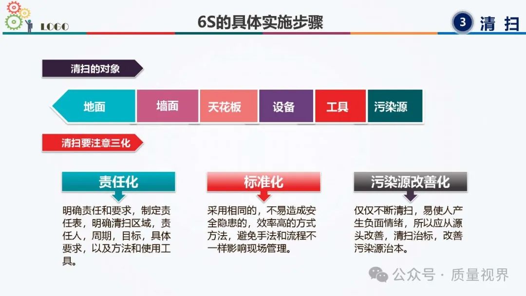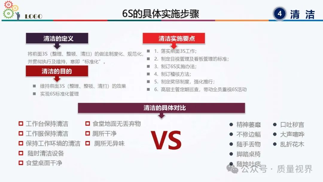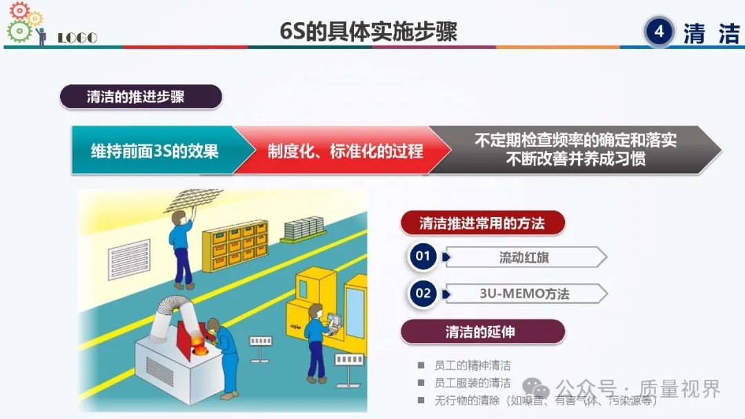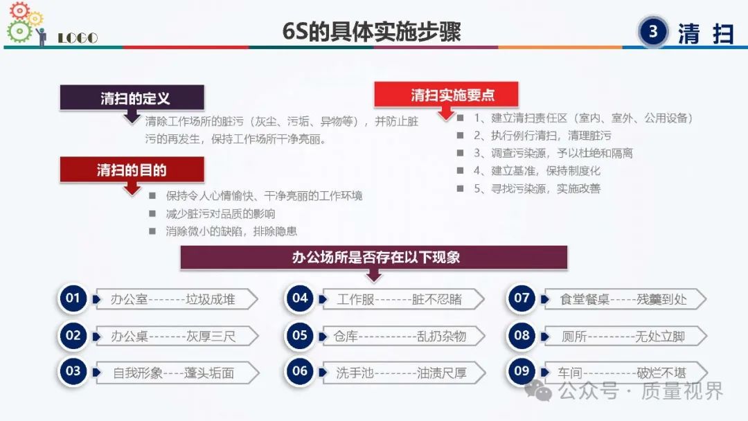 定义:清除工作场所内的脏污,并防止脏污的发生,保持工作场所干净亮丽。划分清扫区域:将工作场所划分为若干个清扫区域,落实到具体的责任人。定期清扫与随时清扫相结合:制定定期清扫计划,同时要求员工在工作过程中随时保持工作区域的整洁。寻找脏污源头:分析脏污产生的原因,采取措施从源头上减少脏污的产生,如对设备进行密封改造,防止漏油。清洁(Seiketsu)