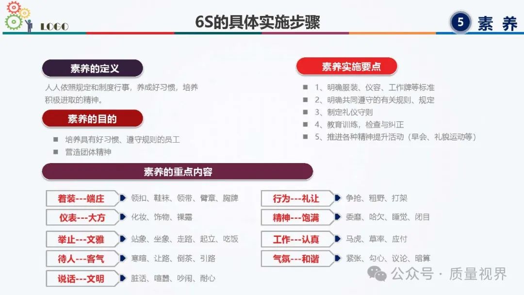 定义:将整理、整顿、清扫进行到底,并且制度化,经常保持环境处在美观的状态。制定清洁标准:明确整理、整顿、清扫的具体标准和要求,如地面无灰尘、设备无油污等。建立检查制度:定期对 6S 执行情况进行检查,发现问题及时整改。强化监督:设立专门的监督小组,对 6S 执行情况进行监督和考核,确保各项工作落实到位。素养(Shitsuke)