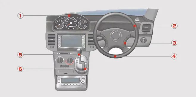 ① 第三煞车灯:防水、提高遮光性 ② 停车灯/倒车灯/闪光灯:防水、提高遮光性 ③ 倒车装置照相机:防尘、防水 ④ 边角感应器:防尘、防水 ⑤ 排气管周围:遮热、隔热 ⑥ 汽油箱绝缘体:遮热、吸收震动 仪表盘周围模切产品的应用 向司机传送重要情报的机器集中在仪表盘周围。在速度仪表器·各种显示灯处,模切产品被作为密封材,防尘材遮光材所选用。