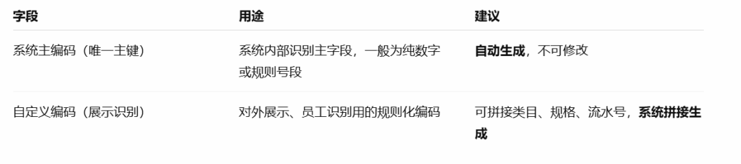 正确做法:系统自动编号 + 统一编码规则 在ERP系统里,一般有两种字段: ![]() 编码规则建议