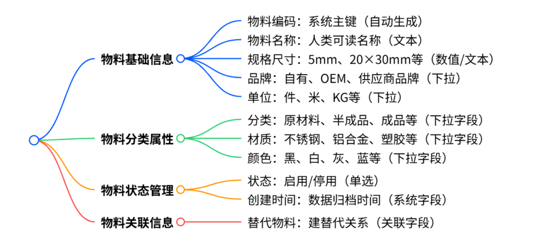 2. 物料属性字段:信息要拆开写,别塞编码里 很多人一上来就想把“材质、颜色、长度、型号”塞进编码里,看起来是想省事,实际上是自找麻烦。 因为——编码是机器识别用的,属性字段才是系统分析和人查用的。 建议配置字段(可按表单字段方式配置): ![]() 为什么这么配?