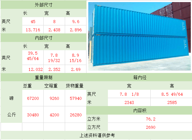 照片名称:45'HQ(High Cube Container 高柜) 备注:正常装货78CBM