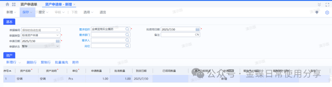 2.2 资产申请单(可选)【业务场景】:企业用户新增资产提交申请 【用户角色】:企业用户 【功能菜单】:【资产管理】->【固定资产】->【资产请购】->【资产申请单】 【操作说明】:资产需求采购部门在系统中创建资产申请单,填写需求组织及部门、所需资产物料(物料属性为资产),数量及到货日期并提交审核。
